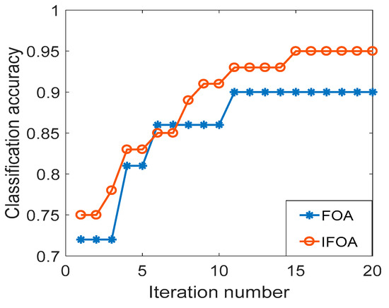 In order to verify that the IFOA algorithm can reduce the local optimization probability and improve the convergence accuracy, the Wine dataset in the UCI database is used to compare the performance of IFOA and FOA. The feature dimension is 13, categories is 3, and the training sample and test sample are respectively 89. The data set is input into the SVM for classification and identification. Figure 3 is the optimization iteration curve of the cross-validation classification accuracy of the Wine data set, where Sizepop is 10 and Maxgen is 20. As can be seen from Figure 2, the FOA curve is relatively monotonous, and it is difficult to jump out of the local optimum. After classification calculation, the classification accuracy of IFOA is 97.75%, the algorithm calculation time is 14.25 s, the classification accuracy of FOA is 92.69%, the calculation time of the algorithm is 12.98 s, and the classification accuracy of IFOA is increased by 5.06%, indicating that IFOA has higher convergence precision. Since IFOA has increased the information on the worst individual information and location update of the population, the calculation time is slightly longer than FOA, but the difference between the two is not large.