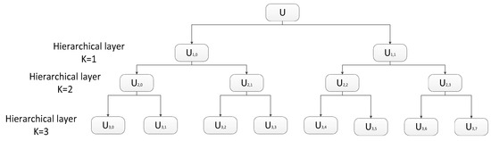 where k represents the k-layer in the hierarchical segmentation, and the original time series u(i) is represented by and in the low-frequency portion and the high-frequency portion of the k + 1 layer. For different k and e, the signals consist of the hierarchical decomposition of signal u(i) in different scales. In Figure 4, the hierarchical decomposition of u(i) in 4 scales is illustrated in the form of a hierarchical tree.