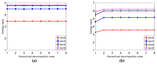 According to the definition of hierarchical dispersion entropy, four parameters need to be set before the calculation of hierarchical fuzzy entropy: signal length N, embedding dimension m, class number c, and decomposition layer number k. Since the k value is too large, it affects the computational efficiency and causes the points involved in each hierarchical component calculation to decrease. At the same time, if the k value is too small, the original sequence band division is not detailed enough to obtain sufficient gradation components from low frequency to high frequency. This paper sets the number of decomposition layers k = 3. In order to evaluate the sensitivity of hierarchical dispersion entropy to signal length N, embedding dimension m and class number, 40 sets of hierarchical dispersion entropy of white noise and 1/f noise of different lengths are calculated, and 40 different levels are calculated. The mean and standard deviation of the nodes are determined by the coefficient of variation (CV), where the coefficient of variation is CV = standard deviation/mean.