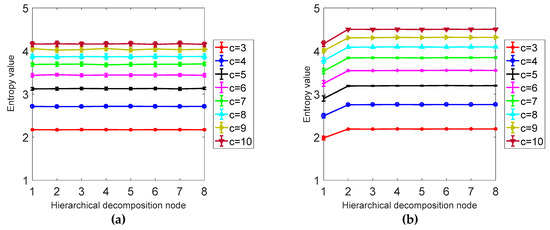 As shown in Figure 5, it can be concluded from a and b that the larger the signal length N is, the higher the stability is, and the smaller the error bar is, the difference between N = 1024 and N = 4096 is not obvious; from Table 1 it can be seen that as the signal length is larger, the smaller the CV value is, the more stable the calculation of HDE is. In this paper, N = 1024 is selected as the optimal signal length. It can be seen from Table 2 and Figure 6 that the CV value of the embedding dimension m = 2 is small, indicating that the HDE value of m = 2 is high and the error is small. In this paper, m = 2 is selected as the optimal embedding dimension. It can be seen from the CV values of different classes in Table 3 and Figure 7. As C increases, the CV value increases, the coefficient of variation of c = 3 is the smallest, and the error rate is the lowest. C = 3 is the best class.