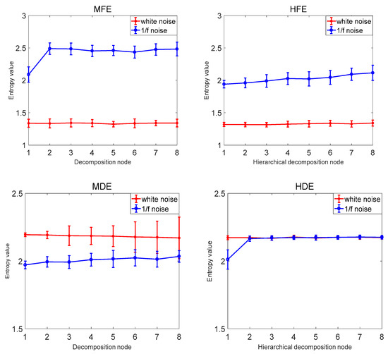 In order to verify that the proposed hierarchical dispersion entropy method is better than the current information entropy method, this paper compares the hierarchical dispersion entropy with multi-scale sample entropy, hierarchical sample entropy, multi-scale fuzzy entropy, hierarchical fuzzy entropy, and multi-scale dispersion entropy. A total of 40 sets of white noise and 1/f noise were used as information entropy to calculate the samples, and the coefficient of variation CV of the same decomposition node of each information entropy was compared. The information entropy parameter selection is as follows: the decomposition layer number k = 3, the signal length N = 1024, the class number c = 3, the embedding dimension m = 2, the scale factor . The comparison results are shown in Figure 8 and Table 4. The MSE and HSE are compared as examples. As the decomposition scale increases, the stability of HSE is significantly higher than that of MSE, and the CV value of HSE of decomposition node 4 is also smaller than MSE, indicating that the hierarchical entropy performance is significantly better than multi-scale entropy; the hierarchical entropy can consider the high and low frequency components, and extract the time mode information more comprehensively and accurately; taking MDE, MSE and MFE as examples to compare, with the increase of the decomposition scale, MDE is more stable than MSE and MFE. The CV value of the decomposition node 4 is also the smallest MDE and the error bar is the smallest, indicating that the performance of the dispersion entropy is significantly better than the sample entropy and the fuzzy entropy. The anti-noise of the dispersion entropy is better, and the bandwidth variation is more sensitive, and it is able to map status information more accurately. It shows that the CV value of HDE is the smallest and the calculation is the most stable. The HDE method is better than the existing public information entropy method, which not only improves the stability of entropy calculation but also reduces the bit error rate of entropy calculation.