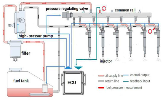 As an important power machinery in production and life, high-pressure common rail diesel engine plays an indispensable role in various industries, and the normal operation of diesel engine is a solid guarantee for our rich life [1,2]. The diesel injector is a key component of the diesel engine, and its working state will directly affect the operating power of the diesel engine [3]. Because the injector works in the high-temperature and high-pressure environment inside the cylinder, faults occur frequently such as nozzle clogging, solenoid valve failure, needle valve stuck, etc. [4]. These failures of the injector may result in abnormal fuel injection and uneven operation of each cylinder and may even result in further reduction in combustion efficiency and more exhaust emissions. Therefore, it is very necessary to diagnose the injector of high-pressure common rail diesel engine. Because the vibration signal combines a variety of information, including gas depletion, combustion shock, structural vibration, noise, etc., resulting in complex data processing and low diagnostic accuracy of fault feature extraction, the fuel pressure in common rail pipe and high-pressure oil pipe can acquire directly injection process information in cylinder [5].