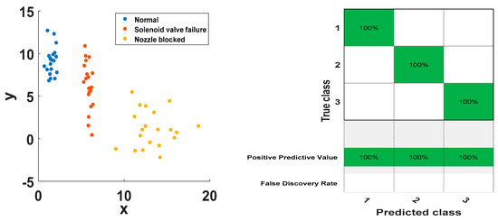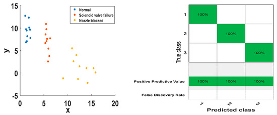 Finally, the hierarchical dispersion entropy of IMF components in different working conditions is regarded as the feature vector for fault state classification and recognition, and the input support vector machine is used for classification and recognition. After obtaining the HDE characteristic parameters, it is necessary to establish an intelligent classifier to realize the automatic fault diagnosis of the injector. When dealing with multi-class classification problems, it is necessary to construct a suitable multi-class classifier. Currently, indirect methods are mainly used to construct multi-class SVM classifiers, such as one-to-one (OVR), one-to-one (OVO), directed acyclic graphs (DAG), partial binary trees (PBT), etc. [39]. This paper uses PBT to construct a multi-fault classifier. The kernel function is an important part of SVM, including linear kernel function, polynomial kernel function, RBF kernel function, and Sigmoid kernel function. The RBF kernel function can approximate nonlinear functions with faster convergence speed and better generalization ability. Therefore, this paper uses the RBF kernel function for classification, with a penalty factor of C = 1000.