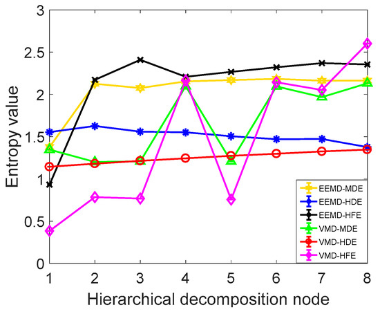 In order to further verify the superiority of the proposed method, it is compared with the commonly used signal decomposition method and the commonly used information entropy method. Using EEMD-MDE, EEMD-HFE, EEMD-HDE, VMD-HFE, VMD-MDE, and VMD-HDE methods to extract the fuel jet pressure wave signal fault characteristics, taking the normal operating condition fuel pressure wave IMF1 component as an example, the extracted information entropy characteristics are shown in Figure 15. As shown in Figure 15 and Table 5, the CV value and calculation time of the VMD-HDE are the smallest, which indicates that the method has the best performance in evaluating the time series complexity, and it has high calculation accuracy, good stability, and the highest computational efficiency.