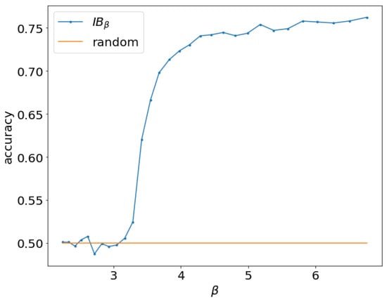 As an example, we train multiple variational information bottleneck (VIB) models on binary classification of MNIST [13] digits 0 and 1 with 20% label noise at different . The accuracy vs. is shown in Figure 1. We see that when , no learning happens and the accuracy is the same as random guessing. Beginning with , there is a clear phase transition where the accuracy sharply increases, indicating the objective is able to learn a nontrivial representation. In general, we observe that different datasets and model capacity will result in different at which IB starts to learn a nontrivial representation. How does depend on the aspects of the dataset and model capacity and how can we estimate it? What does an IB model learn at the onset of learning? Answering these questions may provide a deeper understanding of IB in particular and learning on two observed variables in general.