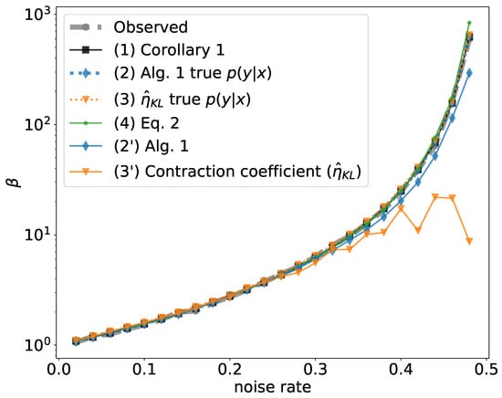 For estimating via (3′) by the algorithm in [18], we use the code from the GitHub repository provided by the paper (At https://github.com/wgao9/hypercontractivity), using the same employed for (2′) Algorithm 1. Since our datasets are classification tasks, we use instead of the kernel density for estimating matrix A; we take the maximum of 10 runs as estimation of .