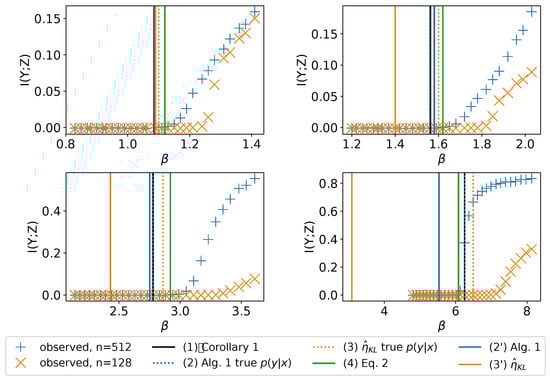 Kolchinsky et al. [9] show that when Y is a deterministic function of X, the “corner point” of the IB curve (where ) is the unique optimizer of the IB objective for all (with the parameterization of Kolchinsky et al. [9], ), which they consider to be a “trivial solution”. However, their use of the term “trivial solution” is distinct from ours. They are referring to the observation that all points on the IB curve contain uninteresting interpolations between two different but valid solutions on the optimal frontier, rather than demonstrating a non-trivial trade-off between compression and prediction as expected when varying the IB Lagrangian. Our use of “trivial” refers to whether IB is capable of learning at all given a certain dataset and value of .