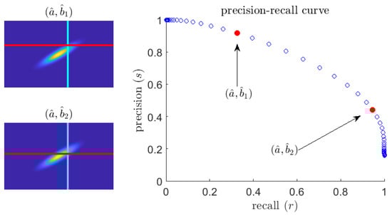 (left) Plot of a sample pdf ; (right) the corresponding precision–recall curve. The parameterized curve is generated by fixing and letting vary.