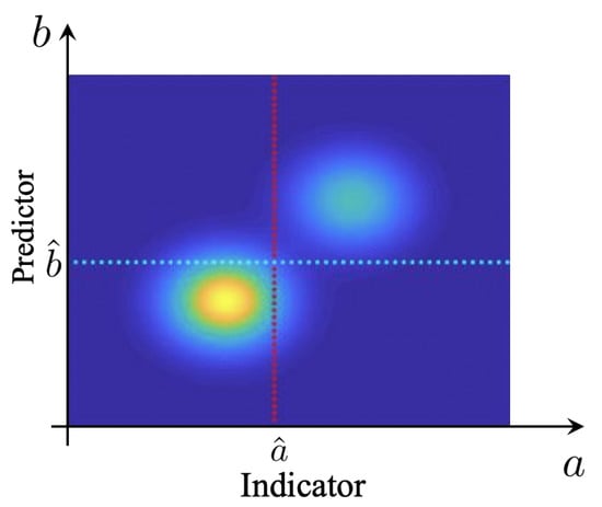 Before we proceed to the definition of a measure that explicitly takes into account the rare event character (or low rate) of extreme events, it is important to study some properties of the precision–recall–rate surface. We are interested in understanding the structure of these surfaces and the implications on selecting predictors, for physical systems exhibiting extreme events. For a large class of such systems, the causal mechanism of extremes are internal instabilities, combined with the intrinsic stochasticity of the system (see, e.g., [14,20,25,26,27]). In this case, the extreme events are distinguishably larger compared with regular events. This is because extreme event properties are primarily controlled by the system nonlinearity and the subsequent instabilities. For such cases, the joint pdf between indicator and predictor has a special structure where two distinguished probability regions can be observed. A sample pdf exhibiting this property is shown in Figure 4.