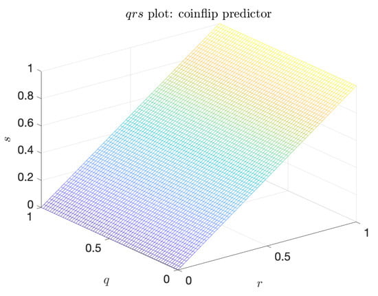 The coinflip predictor is the naive predictor that is completely independent of the indicator. Its characteristic triangular shape, shown in Figure 5, has the minimum value of the volume under the surface: . Further, the coinflip predictor is the baseline against which the metric is constructed. Indeed, for the coinflip predictor, .