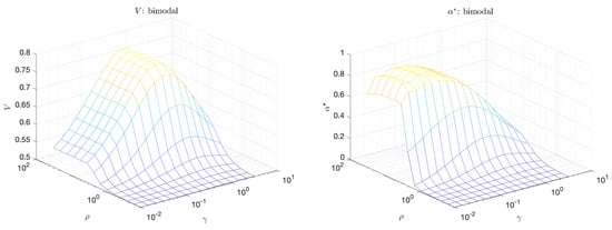 Volume under the curve (V) (left); and maximum adjusted area under the curve () (right) for the bimodal scenario.
