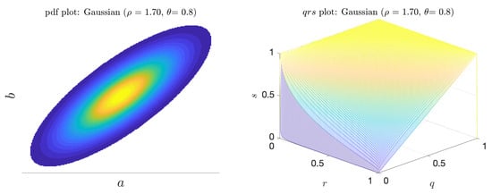 The quantity is a measure, at extreme event rate q, of how much better a predictor B is than the uninformed predictor. When , the predictor does an excellent job of predicting extreme events at the threshold corresponding to the extreme event rate q. Conversely, when (or even ), the predictor is poor at that extreme event rate. Below, we examine several analytical forms of joint pdfs between indicators and predictors, to understand the mechanics of the volume under the surface metric and the maximum adjusted area under the curve.