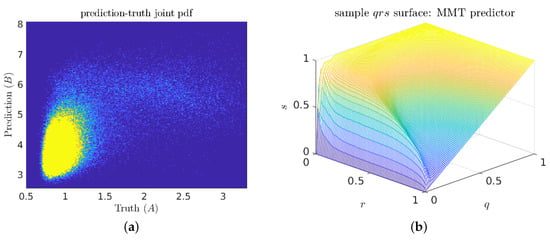 (a) Sample prediction–truth joint pdf for a good MMT predictor; and (b) corresponding surface plot.