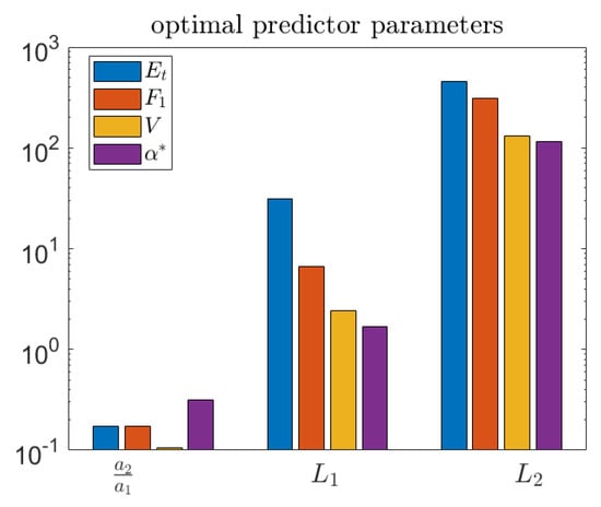 The different choices of objective function lead to different optimal parameters, as shown in Figure 13. Three of the objectives, , V, and , result in similar parameter values, while the total accuracy criterion, , is quite different—generally resulting in longer length scales for the predictor.