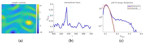 Descriptive plots for the Kolmogorov flow: (a) sample realization of the the vorticity; (b) time series of energy dissipation near an extreme event; and (c) pdf of the energy dissipation.