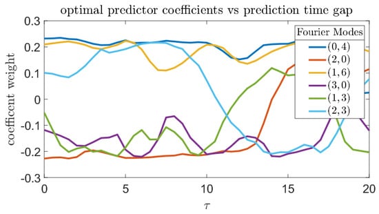 Figure 17 shows the prediction quality of the single-coefficient predictors according to different metrics. By every metric, the Fourier coefficient with wavenumber has consistently good predictive properties. This is consistent with the findings in [14] where a variational approach was employed to compute precursors directly from the governing equations and some basic properties of the system attractor. Figure 18 plots the six most significant from Equation (26) to show the effects of changing on the composition of the optimal predictors.