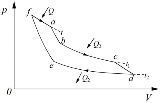 With that in mind, Clausius quantified the two kinds of transformations by giving them “Equivalence-Values”. He employed a thermodynamic cycle made up of three isothermal processes and three adiabatic processes [14,15], as shown in Figure 1. Processes f~a, b~c, and d~e are isothermal processes with temperatures t, t1, and t2 and heat quantities Q, Q2, and Q2, respectively. The other processes are adiabatic processes.
