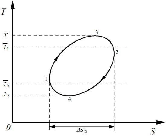 Thus, the heat, Q, can be represented by the area under the curve in the T-S diagram. As shown in Figure 3, the entropy value of the working fluid is minimum at point 1 and maximum at point 2. Therefore, process 1-3-2 is the heat absorption process, while process 2-4-1 is the heat release process. The average temperature of the heat absorption process and the average temperature of the heat release process are respectively in an arbitrary reversible cycle: