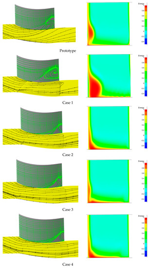 Details of the flow field comparison between the prototype cascade and grooved cascade are shown in Figure 9 only under the +5° incidence angle condition. In any case, the +5° incidence angle is a typical operational configuration and possesses representative characteristics. The effect of the different groove schemes, including their strength, shape, and scope, on the streamlines and separation are large.