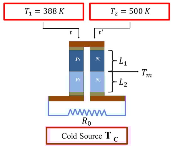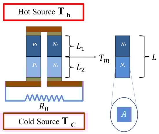 Power generation based on thermoelectric effects, which use new thermoelectric materials technology, is of interest for researchers because it converts thermal energy into electricity and is utilized as a new way to harvest clean energy. To satisfy world energy demands, it is vital to investigate new areas in energy conversion technologies for power generation. Recent research into the improvement of efficiency and reduced costs of thermoelectric materials make essential contributions towards harvesting clean energy [,]. Therefore, advances in the development of new applications to take advantage of renewable energy sources have increased in recent years and are being carried out as a new solution to reduce the use of fossil fuels []. Thermoelectric energy harvesting employs thermoelectric generators. A thermoelectric generator (TEG) is composed of several pairs of p-type and n-type semiconductor elements, known as legs, connected electrically in a series and thermally in parallel.