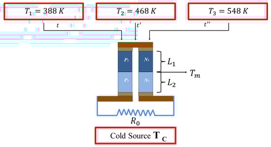 This process is repeated up to a total time of 35 s. For the second case (b), firstly a temperature source of K is applied, then a temperature source of K, and finally a temperature source of K, with each source applied in a period of time of t = 0–5 s, t = 5–10 s, and t = 10–15 s, respectively, as shown in Figure 3. This process is repeated up to a total time of 50 s. In both cases, is placed in the first segment and in the second segment. The load resistance is kept constant throughout this study. Rectangular heat input flux function is used to model the pulse in all cases. In our simulation model, the relevant constant parameters used in the numerical simulation are listed in Table 1.