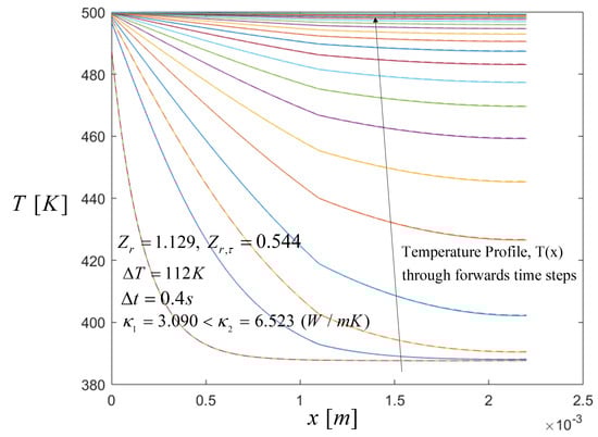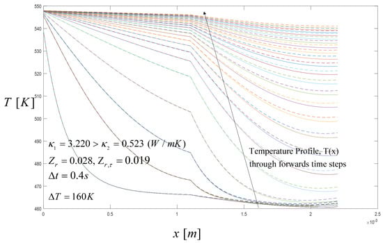 It can be seen that the temperature increases on the hot side, i.e., in the first segment, at the moment when the heat pulse was applied which caused an increase in the temperatures in a specific length and here no change in the interface was observed for the first instants of time. After s there was a change at the interface because the value of the thermal conductivity of the was higher than the material , W/mK and W/mK respectively, and therefore heat was preferentially conducted toward the cross-sectional area easily in the first segment. Notice that the heat absorbed in the first segment was due to material, and the heat released in the second segment was due to .