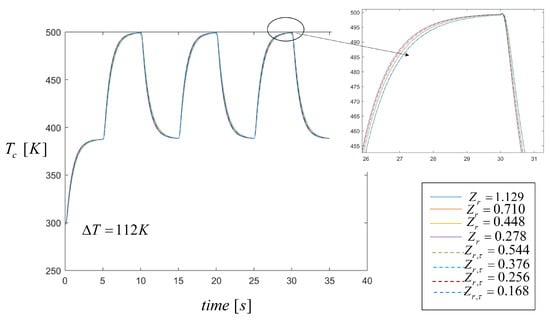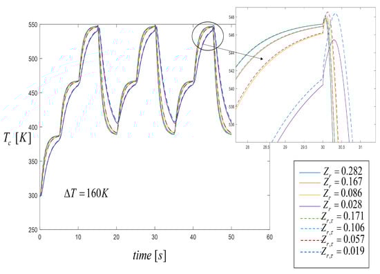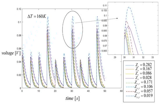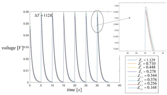 In this paper, the thermal characterization was made considering open-circuit conditions. The application of the two transient rectangular pulsed heat power is shown in Figure 5 which shows the transient behavior of the cold side temperature, , for different and values shown in the figure. As shown from these results, the temperature profiles were not affected by the Thomson effect as is well known from the literature and only output voltage results change considering the Thomson effect, as demonstrated in the next section. To show the periodic behavior of the system when the pulses were repeatedly applied, the total time in all simulation was set to 35 s. Simulations were performed by varying the thermal conductivity of the material to obtain the different values of and this range spanned the cases when to . It can be seen from these results that the cold side temperature values were very similar for all values where the thermal conductivity, electrical resistivity, and Seebeck coefficient of the material remained as constant values, i.e., , and only material properties of were changed in order to vary values.