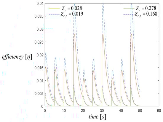 Efficiency when three heat input pulses are applied with a duty cycle of 50 s for the cases when and , lower efficiency, and and , maximum efficiency. Comparison results with the Thomson effect (dashed lines) and the without Thomson effect (solid lines).