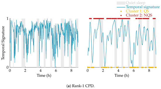 Once the non-negative polyadic decomposition of the multiscale entropy tensor is performed, the temporal signature of the selected component is used to define the neonate’s sleep stage. This temporal signature shows a (slow) cyclic pattern reflecting the sleep staging of the infant. However, there are high frequency oscillations superimposed on this pattern, which could lead to incorrect sleep stage identification. Therefore, a postprocessing step consisting of smoothing the temporal signature using a moving average filter with length L equal to 5 is applied. This moving average filter is applied in both directions (to avoid phase distortion), so actually a weighted moving average filter is used with triangular shape and length 2 × L. This smoothing operation accounts for the fact that a sleep stage does not change instantly. More specifically, sleep periods were only visually labeled as quiet sleep if 3 consecutive minutes or 3 out 4 min were clinically detected as quiet sleep.