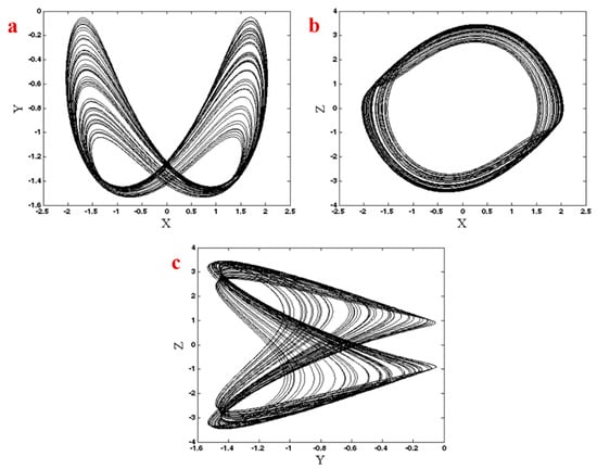 Chaotic attractor of System (1) in three different planes, (a) plane, (b) plane, (c) plane.