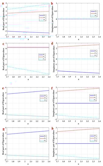 Real and imaginary parts of equilibrium points in a∈[1.7,2.4]. (a) Real part of Eigenvalues of , (b) imaginary part of Eigenvalues of , (c) real part of Eigenvalues of , (d) imaginary part of Eigenvalues of , (e) real part of Eigenvalues of , (f) imaginary part of Eigenvalues of , (g) real part of Eigenvalues of , (h) imaginary part of Eigenvalues of .