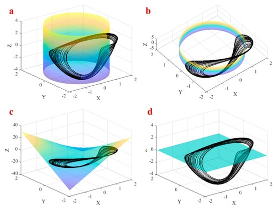 The average of , and of the system should be zero to have a bounded solution []. Therefore, in each attractor of the system, such as periodic and chaotic, the average of each derivative is zero. In other words, we have . Thus, , , and . The condition means that the attractor of the system should be above the plane at sometimes and bellow the plane at some other times. Therefore can be zero on the attractor of the proposed system. Condition means that each bounded solution of the proposed system should cross the inside and outside of the cylinder repeatedly. The attractor of the system should cross the manifold to satisfy the condition . Figure 3 shows the chaotic attractor in and these three conditions which are satisfied by the attractor. Figure 3a,b shows the cylinder (from two points of view) which is crossed by the chaotic attractor repeatedly. The manifold and the chaotic attractor are shown in Figure 3c of the figure. Finally, the plane and the attractor are shown in Figure 3d.