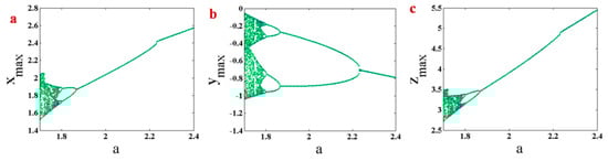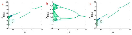 Bifurcation diagram of System (1) with constant initial conditions . (a) maximum values of variable by changing parameter ; (b) maximum values of variable by changing parameter ; (c) maximum values of variable by changing parameter .