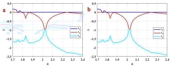 Lyapunov exponents of System (1) related to the bifurcation diagrams of Figure 4 and Figure 5 are calculated using Wolf’s method [] and run time 20000. Figure 6a presents Lyapunov exponents of System (1) with backward continuation. Positive Lyapunov exponents of the system in some intervals of parameter prove the existence of chaos. Figure 6b shows Lyapunov exponents of System (1) with constant initial conditions. Comparing Lyapunov exponents plotting by these two methods shows that however, the system shows multistability by two initiation methods, but the quality of the multistable attractors is the same since their Lyapunov exponents are the same.