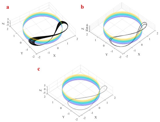 Investigating variations of the attractor of the system by changing parameter is very interesting. Parameter changes the radios of the cylinder. It was discussed that each attractor of the system should cross the cylinder repeatedly. Therefore, we can change the domain of attractor in the plane by changing parameter . Figure 7 shows the attractor of System (1) which crosses the cylinder with radios in three parameters , as shown in Figure 8a–c.
