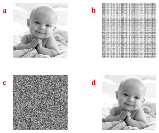 (a) The original baby image, (b) the shuffled rows and columns of the baby image, (c) the encrypted image, (d) the decrypted image.
