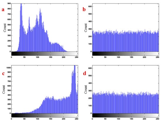 Histogram of an image shows its distribution of color values. Figure 11a shows the histogram of the Lena image. It can be seen that the distribution has a special form which depends on the colors of this figure. The desired encryption method should change the distribution of the encrypted image to uniform, so there is no possibility that the encrypted image can be broken. Figure 11b shows the histogram of the encrypted Lena image. It can be seen that the distribution is approximately uniform. Figure 11c,d shows the histogram of the original baby image and its encrypted image. The results present the power of the proposed chaotic system in the encryption.