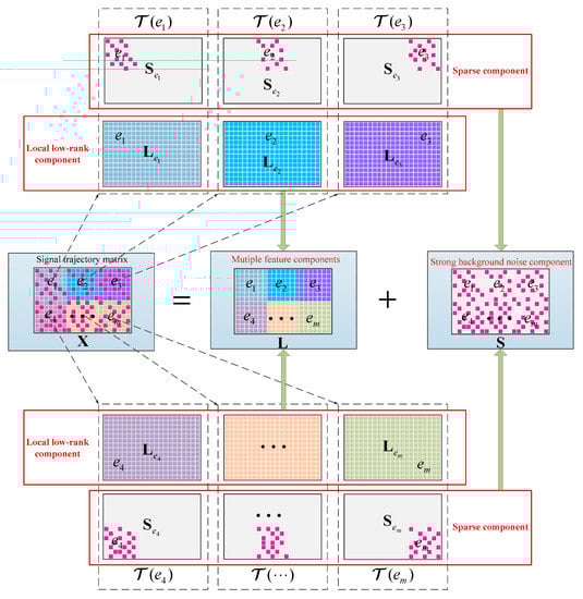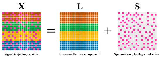 By referring to manifold learning theory, it can be found that the feature component in has a low-dimensional submanifold structure [26,27]. RPCA can extract this structure by solving the following low-rank matrix and sparse matrix decomposition model (shown as Figure 1):