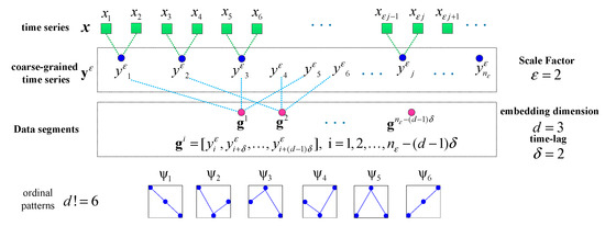 The MPSE can efficiently evaluate the dynamic complexity and randomness of the time series under different scales. The calculation of the MSPE depends on three parameters: scale factor , embedding dimension and time-lag [32,36]. For a signal time series , the main calculation steps can be divided as follows: