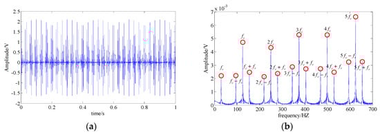 One accepted approach to fault identification is to identify the fault-related frequency contents from the signal spectrum. For example, Figure 4 shows the waveform and the spectrum of a simulated bearing’s inner race fault signal, and the related frequency content includes: the fault feature frequency , its harmonic frequencies , the rotational frequency , and the modulated side band formed by their combination ; Figure 5 shows the waveform and the spectrum of a bearing outer race fault signal. The frequency content includes: the fault feature frequency and its harmonic frequencies . It can be observed that nonlinear and non-stationary nature of these fault signals increases the complexity of the spectrum. Especially in the fault of inner race, where the complex modulation side band appears. As a result, the dynamic characteristic of the inner race fault should be more complex than that of outer race fault.
