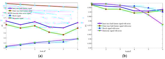 The common interference components in bearing signals include the shock signals generated by other parts and the harmonic signals. Therefore, without loss of generality, we discuss the MSPE characteristics of different types of components bearing fault signals, including the fault feature signals of the bearing’s inner race (shown as Figure 4) and the bearing outer race (shown as Figure 5), a harmonic signal, a shock signal, and a Gaussian white noise signal. The results of these five type signals are shown as Figure 6a. The results demonstrate that the MSPE value of a regular time series, such as harmonic signal or shock signal, is smaller, the examples being basically below 0.3; in contrast, since advent of the complex dynamic characteristic, the MPSE values of the bearing fault feature signals are larger, ranging from 0.4 to 0.7. In addition, it can be observed that the MSPE value of the inner race fault is larger than that of the outer race. In particular, the randomness of the noise signal is the strongest with the MSPE value more than 0.9, which proves that the MSPE is sensitive to noise.