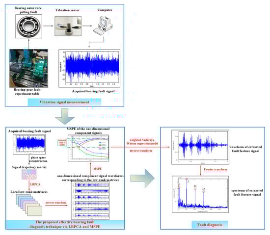 In this paper, an effective bearing fault diagnosis technique via local robust principal component analysis (LRPCA) and MSPE is introduced. Firstly, on the basis of noise suppression, we proposed an improved RPCA method to decompose the signal into several single-components, which was termed LRPCA. According to CLSLRMA, in the phase space of the weighted matrix associated with different anchor point, we assume that the signal trajectory matrix behaves as a combination of a noise component and a low-dimensional submanifold component, and those submanifold components represent different feature components in the raw signal. LRPCA shows that those submanifold components can be approximated by low-rank matrices through solving a convex program about a weighted combination of the matrix rank constraint function and the -norm regularization [36,37]. After that, the MPSE was adopted to identify the low-rank matrices corresponding to the fault feature component. Finally, the identified low-rank matrices were transformed into a one-dimensional signal to represent the global approximation of the fault feature component for further diagnosis via weighted Nadaraya–Watson regression model [38]. The processing of the numerical simulation data and the experimental bearing fault data both verified that the proposed technique can provide a great diagnostic performance for bearing faults.