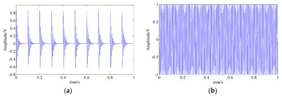 where is the simulated fault feature signal of a bearing’s inner race, as shown in Figure 4, and its detailed parameters are listed in Table 1. and are the interferences of a shock signal and a harmonic signal, respectively. Figure 8a,b shows the waveforms of these two signals and both of their feature frequencies are 150 Hz. represents the strong background white Gaussian noise. The signal sampling frequency and the sampling point are 20,000 and 20,000, respectively.