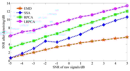 The threshold range representing the bearing fault feature component was determined based on the results of simulation experiments. However, the feature components of the acquired bearing fault signals should be much more complex than simulated signals. Therefore, we will focus on determining a more appropriate threshold range for acquired signal in future work. In addition, the de-nosing performance of proposed LRPCA method was verified by the signal simulation Equation (20), and Figure 9 shows that it performs better than other methods. In fact, the robustness of the method can be improved by statistical evidence. By extending the evaluation to greater number of rounds, the results of each round are collected, and through meaningful statistical tests, the parameters of the method can be optimized, leading to a significant improvement in noise reduction performance. Therefore, we will also carry out more deep research to that end in future work.