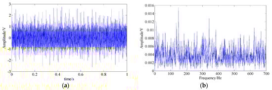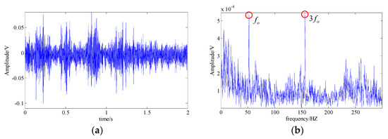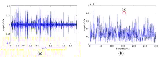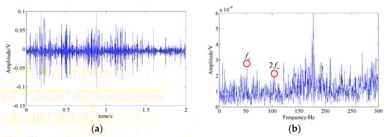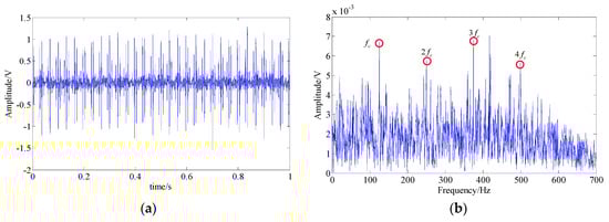 The acquired bearing fault signal; (a) signal waveform; (b) signal spectrum.