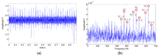 In the basis pursuit denoising method, we adopted the compressed sensing reconstruction algorithm [54] to extract the fault feature signal and Figure 12 shows the final analysis result. In the resulting spectrum, the Fault harmonic frequencies (−) and their modulated sidebands (, , and ) could be identified. But, there were still a lot of interference frequency components and strong background noise, leading to the fault of the signal not being directly determined.