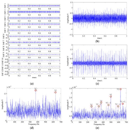 In the EMD, fourteen IMFs can be obtained by decomposing the signal and the waveforms of their top twelve are shown in Figure 13a. By applying Fourier transform to these IMFs, in the resulting spectrums of IMF3 and IMF4, partial fault-related frequency contents can be found; i.e., fault harmonic frequencies (−) and the modulated sidebands (, , and ). The waveform and the spectrum of these two IMFs are shown in Figure 13b–e. However, there were still plenty of interference frequency components and noise, which are adverse to the identification of fault feature.