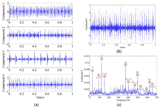 In the SSA, by setting the threshold value of the energy of singular value to reach 95% of the total, four singular subspaces representing different feature components can be obtained. Figure 14a illustrates the waveforms of the corresponding one-dimensional feature component signals of these four subspaces obtained through inverse transform. Then, through similarity analysis, it was concluded that components 2 and 4 had higher similarity with the raw fault feature signal. Thus, the signal obtained by adding them represents the extracted fault feature component. The waveform and the spectrum of this extracted signal are shown in Figure 14b,c. In the spectrum, some fault-related frequency contents could be found. But, similar to the analysis result of EMD, there were also some interference frequency components and noises, which may have had an adverse effect on the final diagnosed result.