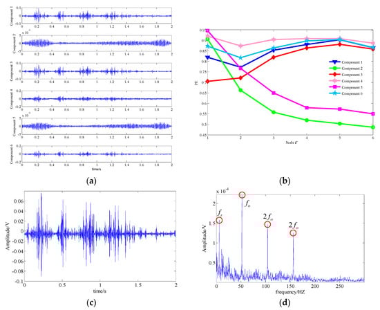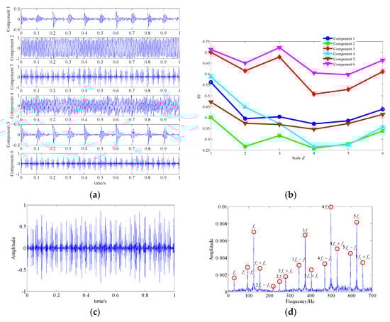 Analysis result of the proposed technique; (a) waveform of the one-dimensional component signals; (b) the MSPE of the components; (c) waveform of the extracted fault feature signal; (d) spectrum of the extracted fault feature signal.