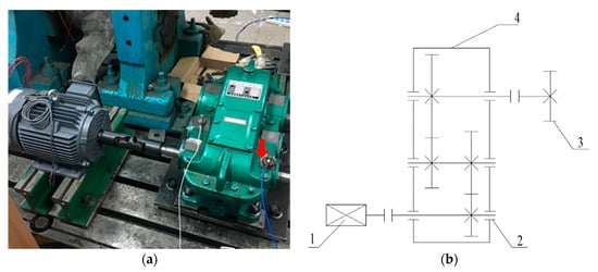 Bearing-gear fault experiment table; (a) physical photograph; (b) structural drawing: 1—AC motor; 2—the mounting position of fault bearing; 3—magnetic powder brake; 4—gearbox.